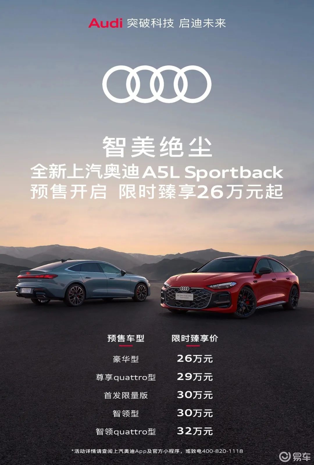 预售价27.99-33.99万元,限时臻享价26-32万元,这是上汽奥迪A5L在7月3日开启预售时公布的价格。