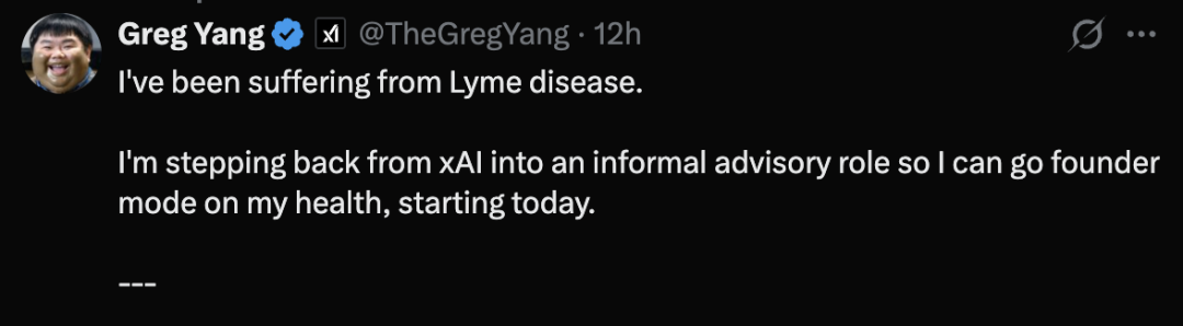 xAI的工作强度非常大,马斯克特别能push,就在昨天联合创始人Greg Yang因为生病退出xAI的工作了