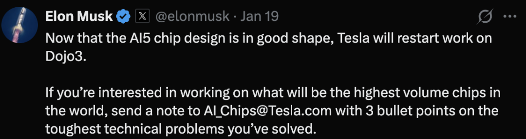 马斯克也已经正式官宣AI5 芯片设计已经成熟,特斯拉将重启 Dojo3 的研发工作,下一步可能还要建芯片工厂