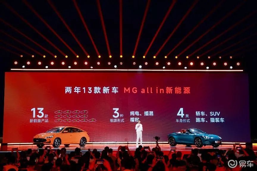 未来2年,MG将迎来产品密集投放期,陆续推出13款新能源产品,覆盖纯电、插混、增程3种新能源形式,涵盖轿车、SUV、跑车及猎装车4大车身形式。