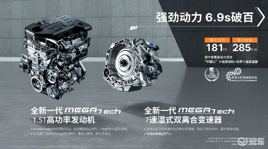 动力上,1.5T+7DCT“双十佳”黄金动力组合:全新一代“蓝芯”1.5T高功率发动机,最大功率达到了133kW,峰值扭矩为285N·m。搭配行业首创的三腔分离技术的7速湿式双离合器变速箱,不仅换挡平顺、响应迅速,还具有良好的经济性和耐用性,其传动效率更是高达97%。“双十佳”动力总成完美配合,MG5零百加速仅需6.9秒。