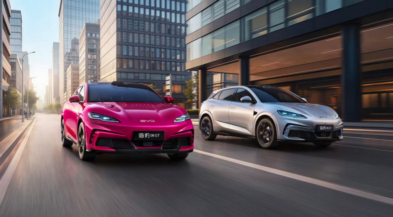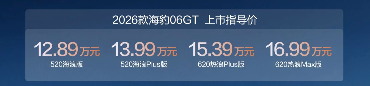 海豹06GT官方指导价12.89万至16.99万元,提供镜海银、波西娅玫红等外观配色及暮紫/暖白内饰。