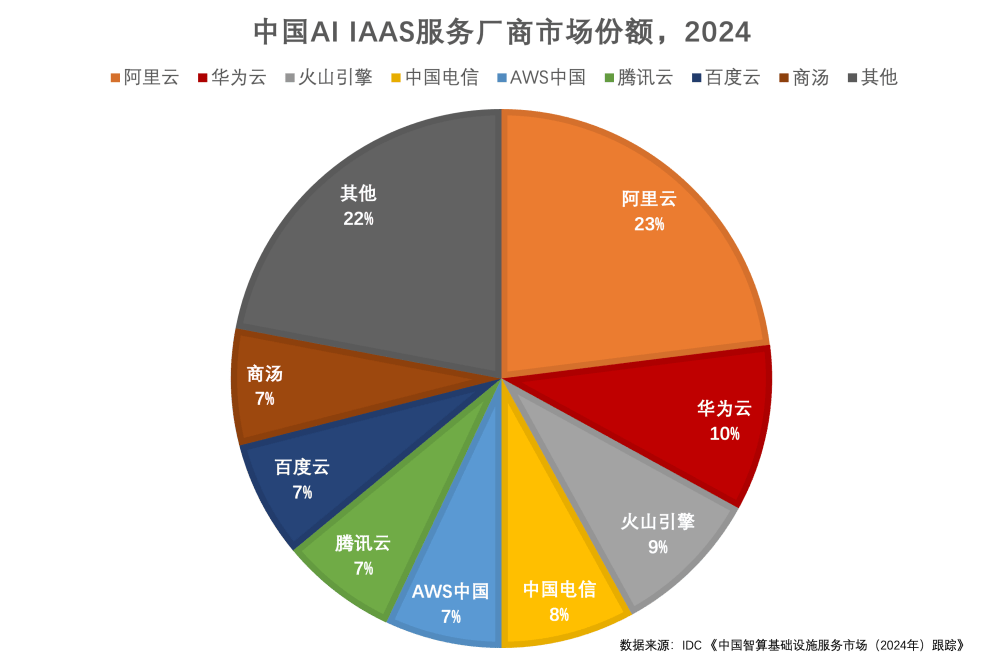 在市场份额方面,2024年全年,除阿里云占比23%外,华为云占比10%,火山引擎占比9%,中国电信占比8%,腾讯云、百度云、AWS中国、商汤皆占比7%。