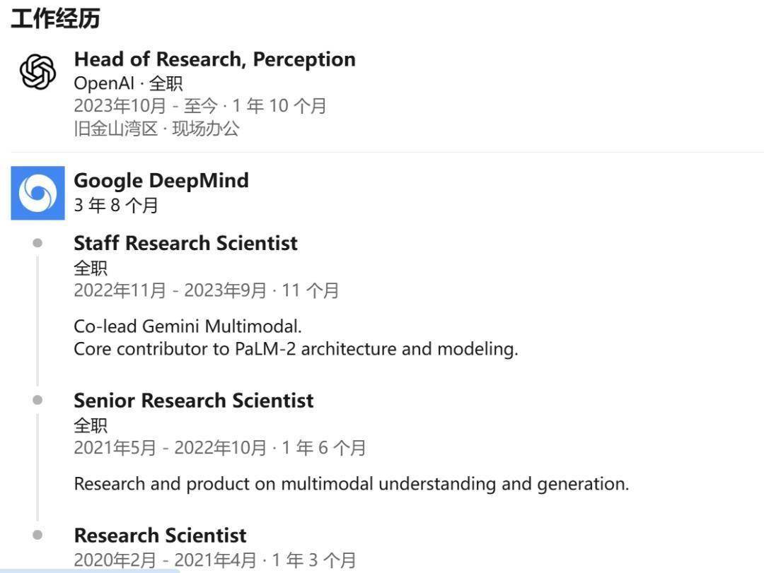 在 OpenAI 期间,他是 o3/o4-mini/GPT-4.1/GPT-4o 共同创建者,曾任 OpenAI 感知团队负责人,Gemini 多模态系统联合主管。