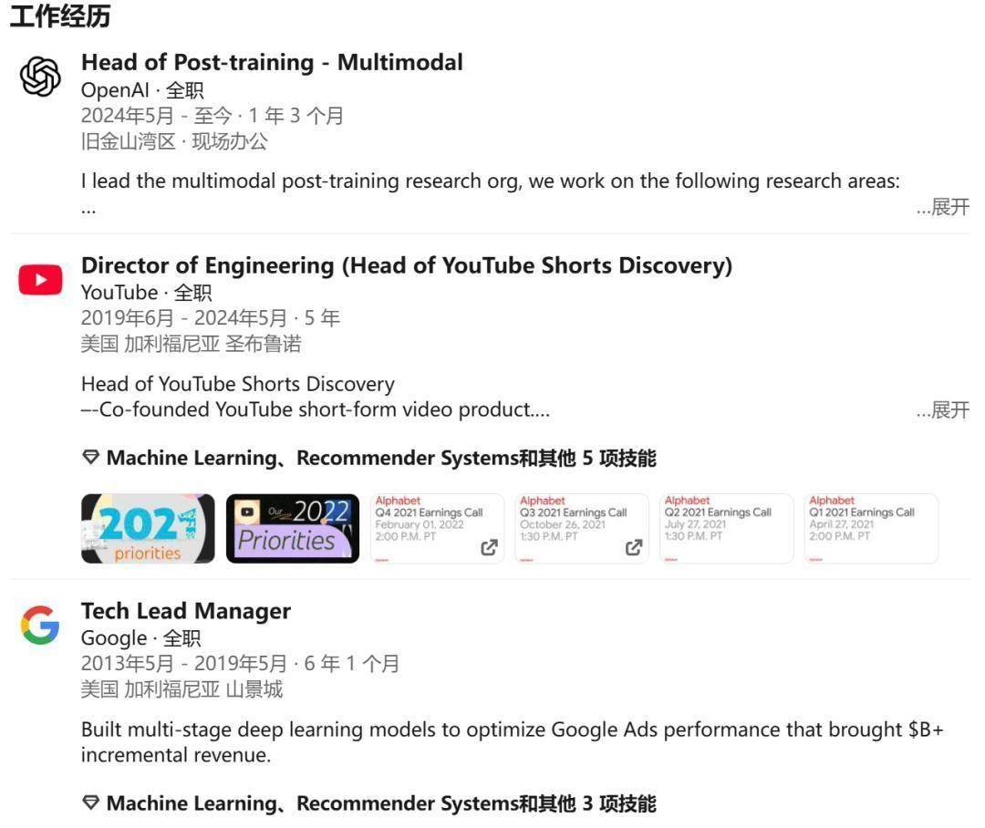 在加入 OpenAI 之前,毕树超担任「YouTube Shorts 」部门负责人, 这是谷歌为下一代创作者与观众打造的重要战略产品,后被列为公司最高优先级项目之一 。在此之前,毕树超还在谷歌任职 6 年,主要研究多阶段深度学习模型,优化谷歌广告业务,给谷歌带来了超过上亿美元的增量收入。