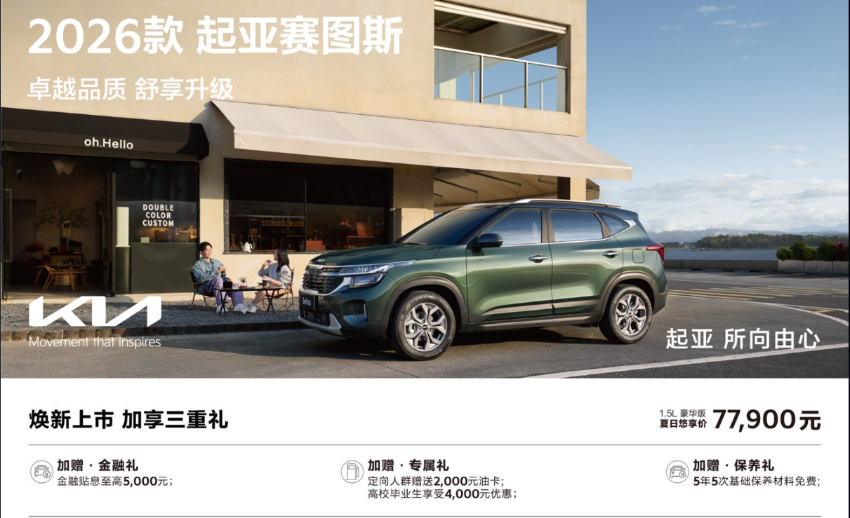 2026款起亚赛图斯在7月2日正式上市,这次新车一共推出了8种不同配置的车型,新增“1.5L豪华舒享版”。从7月1日到7月31日,如果你买1.5L豪华版车型,可以享受“夏日悠享价”,价格是77,900元。
