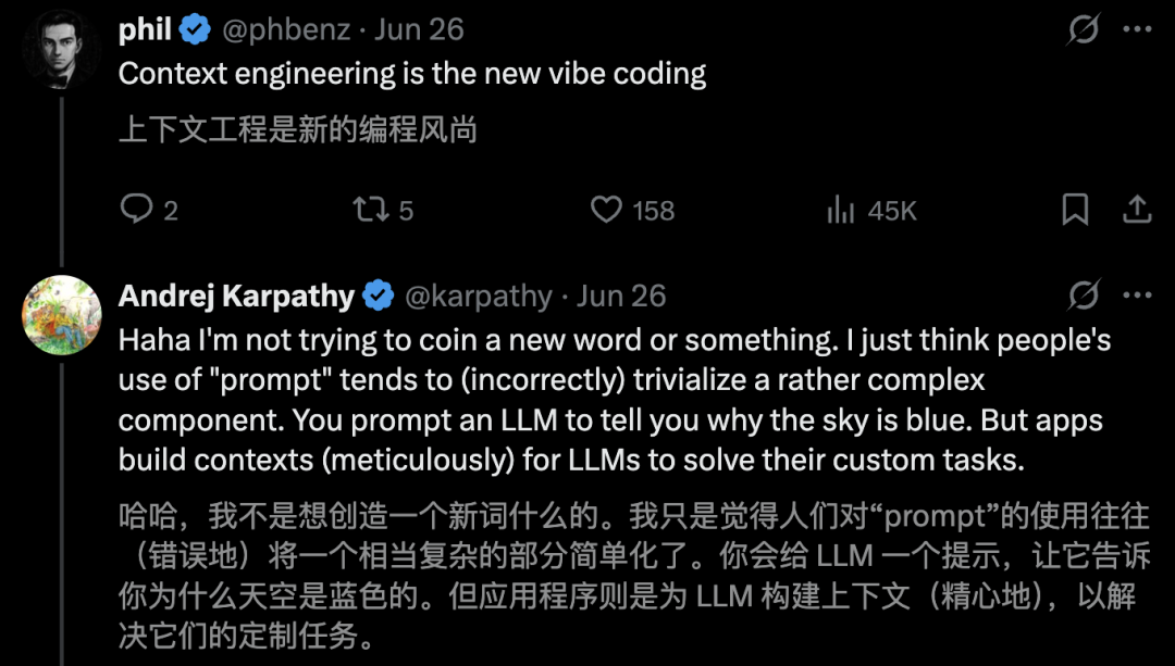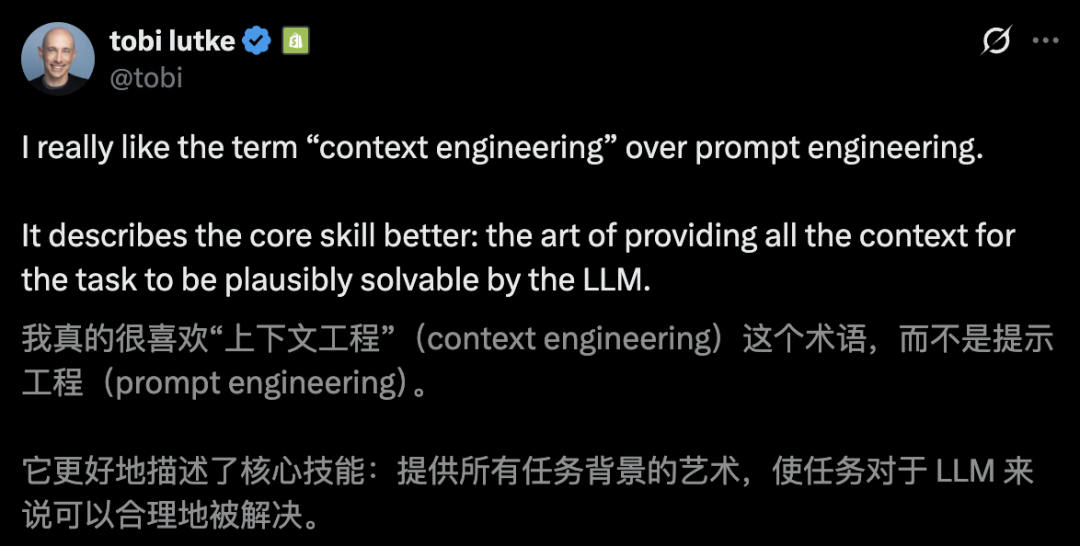 还有Shopify CEO Tobias Lütke称,自己更喜欢「上下文工程」,因其准确描述了一个核心技能——