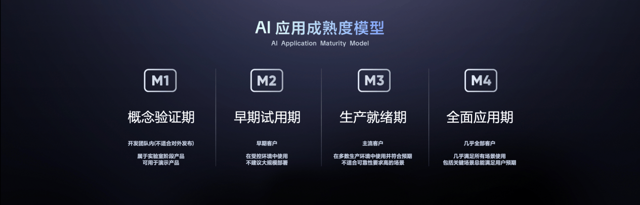 飞书发布的“AI应用成熟度模型”将AI应用分M1—M4四个等级。简单来说,M1为概念验证,只能做内部演示;M2是早期试用,给愿意尝鲜的用户用;M3意味着成熟应用,可以大规模使用;M4则意味着完全成熟,在适合的任何场景都可使用。