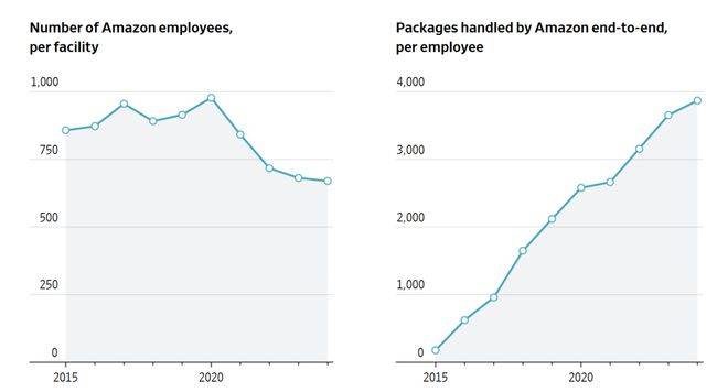 《华尔街日报》发现,去年亚马逊每个仓库平均只有670名员工,是过去16年最低的。