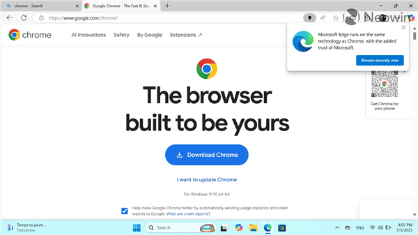 7月6日消息,微软在两年多前开始在Chrome官方网站上植入Edge广告,当用户通过Edge浏览器下载Chrome浏览器时,页面顶部会出现一个巨大的广告横幅。