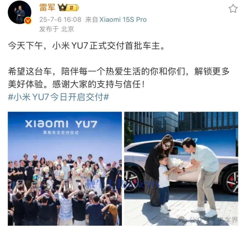 小米集团创始人雷军刚刚发布微博,录播了YU7首批车主交付!