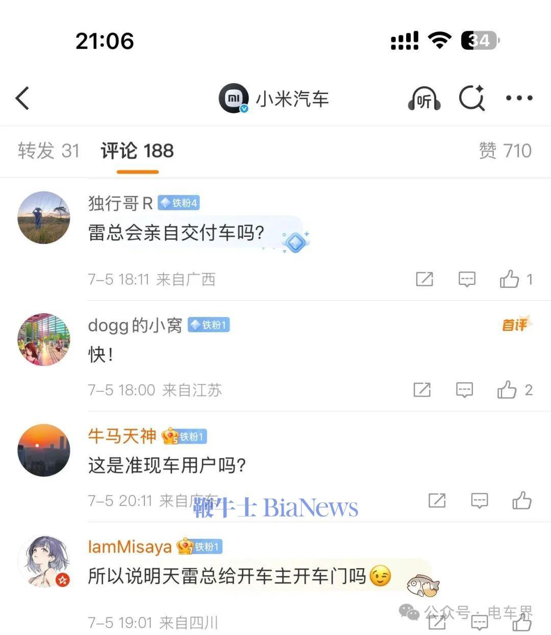 小米汽车官微跟帖也是询问雷军是否开车门。