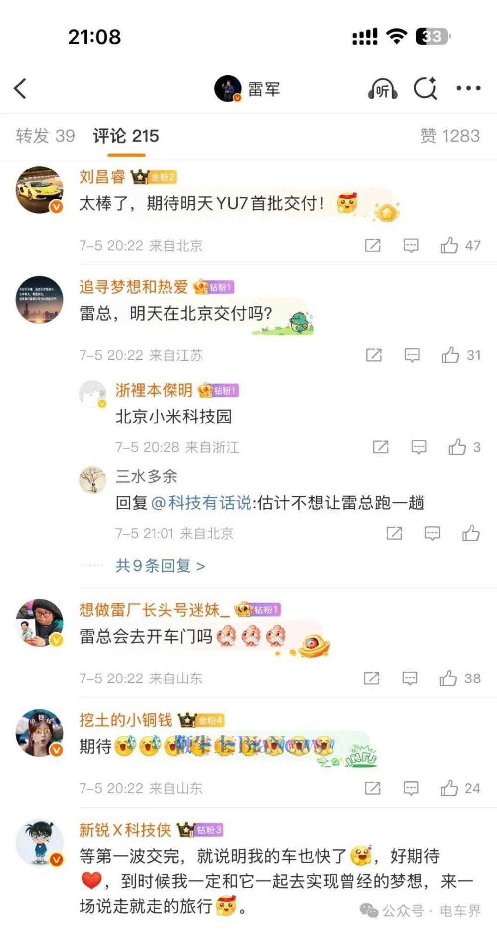 雷军昨天在微博上官宣首批YU7今天交付,全国58城同时开启。
