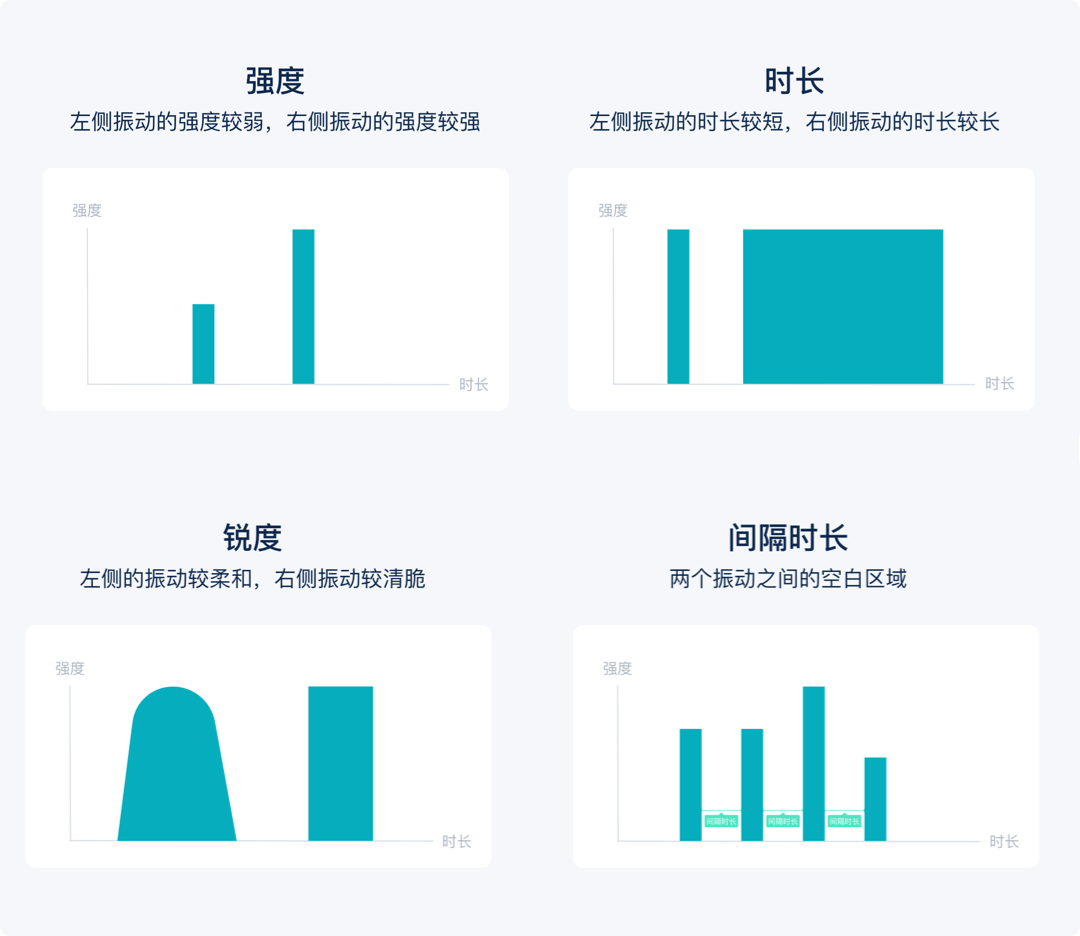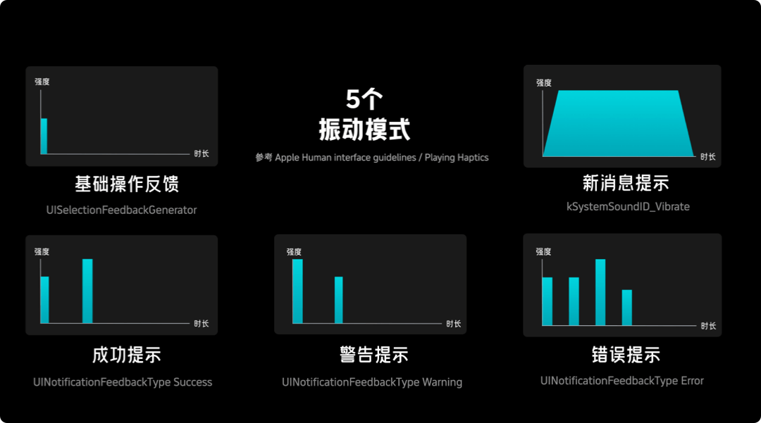基于振动的不同含义,我们从苹果人际设计指南中摘取了5个有最多应用可能的振动模式,并对他们分别进行了更直观的命名,分别是:
