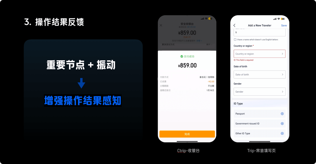 第三个应用方向是作为一种更丰富的操作结果反馈,我们在流程中的重要节点,例如支付成功或填写页提交报错时,增加振动反馈,来进一步增强用户对操作结果的感知。