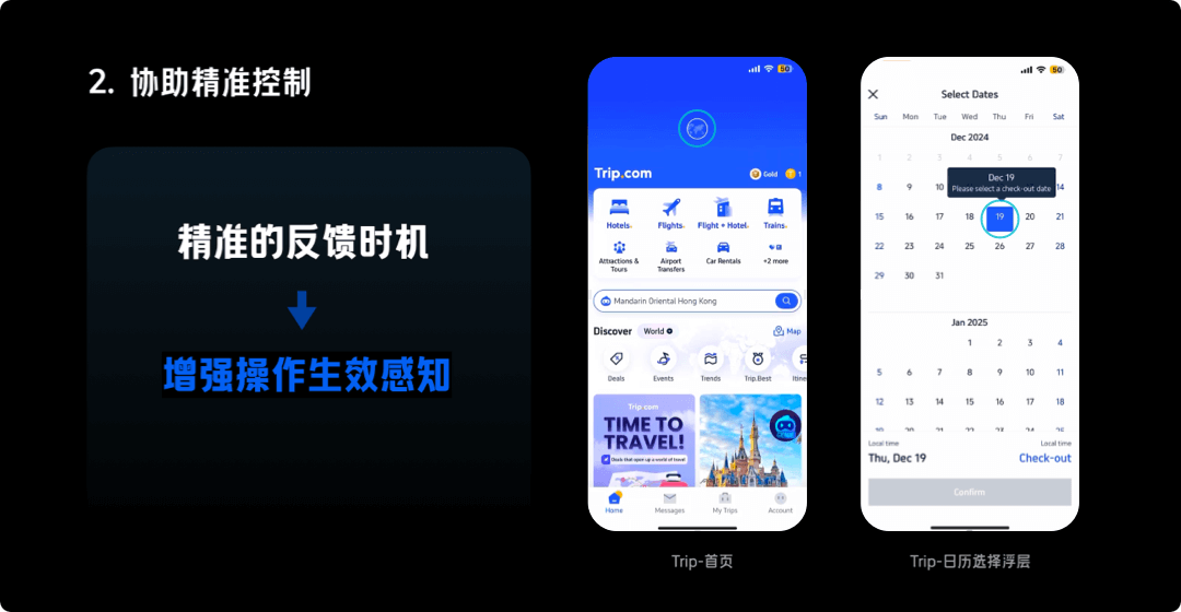 第二个应用方向是协助精准控制,我们在一些视觉反馈效果不够明确的点位,例如下拉刷新到达临界点 / 日历的选择日期生效时,增加振动反馈,通过振动精准的反馈时机,来增强用户对操作生效的感知。