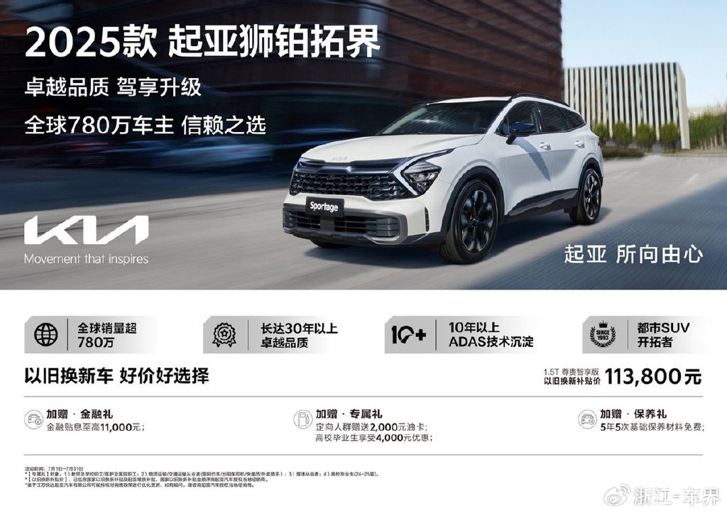 作为“全球都市SUV开拓者”,狮铂拓界30余载历经五代传承,凭借卓越的品质赢得超780万全球用户的青睐。目前,2025款起亚狮铂拓界已正式上市,新车在继承“Sportage”经典品质与全能实力之外,更结合中国用户的实际出行需求,1.5T和2.0T车型各新增豪华舒享版、尊贵智享版2个车型版本,升级了用户高频使用的全景天窗、驾驶席电动座椅(6向)、外后视镜电动折叠/加热、SVM360°全景影像和BVM侧后方影像等舒适、智能配置,让出行舒适性与安全性得到进一步提升。
