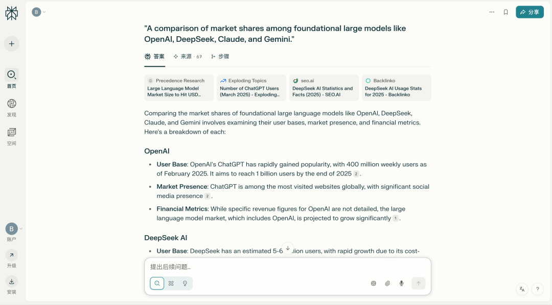 这一理念最直接的体现,就是Perplexity的“答案生成必须可溯源”机制。不同于ChatGPT等纯生成型AI产品,Perplexity所有回答都附带出处链接,用户可以随时核验。这种做法让它在“内容真实度”上形成显著优势,也成为获得用户长期信任的基础。