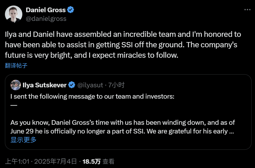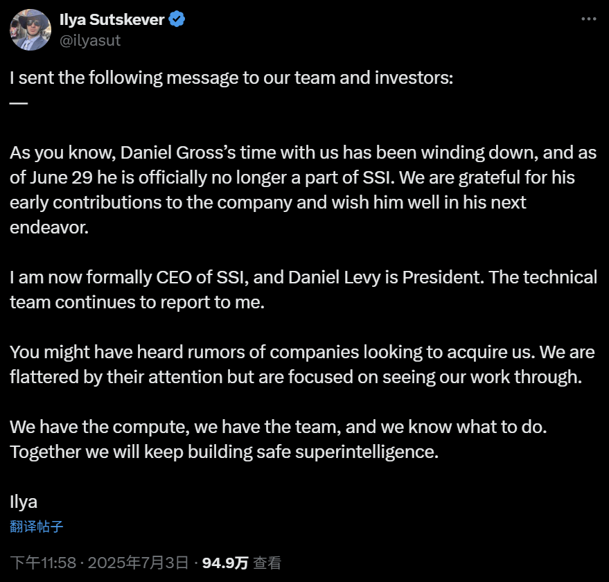 正如你们所知,Daniel Gross在我们公司的时间已接近尾声,自 6 月 29 日起,他已正式退出Safe Superintelligence(SSI)。感谢他对公司早期的贡献,并祝愿他在未来的工作中一切顺利。