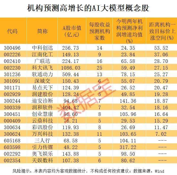 从未来增长潜力来看,根据5家以上机构一致预测,今明两年净利润增速均有望超20%的AI大模型概念股有18只。净利润预测增速均值靠前的是引力传媒、迪安诊断、创业慧康、三人行、万兴科技等。