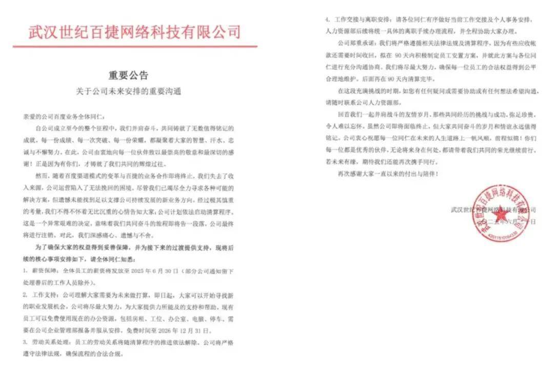 6月30日,一封公告悄然出现在武汉光谷的世纪百捷办公区内,宣告着全体员工工资发放至当日,公司即将依法启动清算程序。这则消息如同一枚重磅炸弹,在业界掀起了轩然大波。毕竟,这家成立于2003年的企业,曾是湖北地区百度营销的总代理,见证了互联网营销的黄金十年。