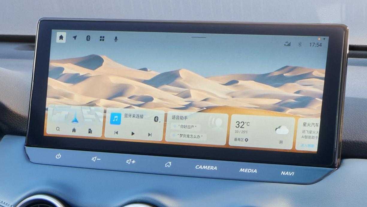 在大屏之上,手指轻触即可完成所有操作,切换丝滑流畅。同时,高清中控屏下方保留一组实体按键,方便用户驾车中途盲操,安全快速的调控车机和切换功能。