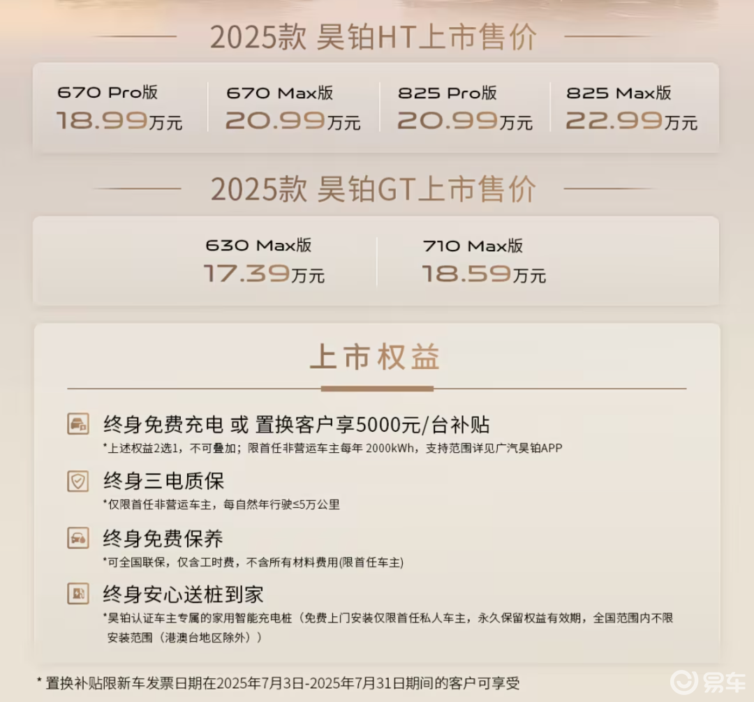 近日,新款昊铂HT/GT上市。其中昊铂HT共推出4个版本,售价18.99-22.99万元;昊铂GT共推出2个版本,售价17.39-18.59万元。具体购车权益如下: